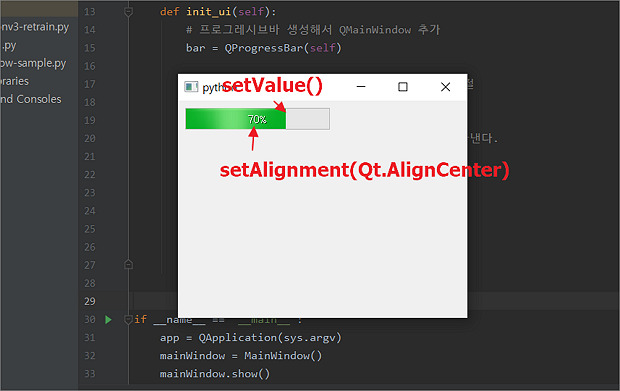 ▼ 구현은 간단합니다. QProgressBar 를 만들고 생성자 함수로 self 를 넘깁니다. self 는 QMainWindow 를 가리킵니다. QProgressBar 는 생성자에서 QMainWindow 를 파라미터로 넘겼기 때문에 별도로 작업할 필요가 없습니다. 다음은 setGeometry() 함수로 QMainWindow 에서 QProgressBar 가 위치할 곳을 지정합니다.