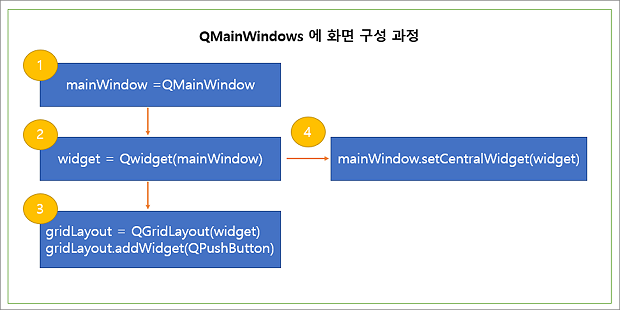 ▼ 각 객체의 포함관계는 다음과 같습니다. QMainWindow 에는 QGridLayout 을 추가하기 위해서는 QWidget 이 필요합니다. 마지막에는 QWidget 을 QMainWidow 에 추가하는 것입니다.