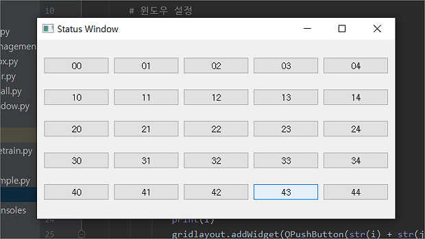 ▼ 위의 그림 1번에서 3번까지 과정에 대한 소스입니다. QWidget 의 생성자에 들어간 self 는 QMainWindow 객체 입니다. 버튼은 2중 for 문을 돌면서 QGridLayout 에 다수의 QPushButton 을 추가했습니다.