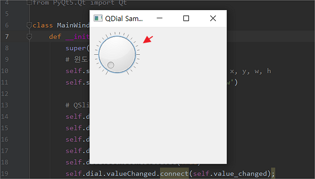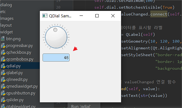 먼저 다이얼객체에 시그널 함수인 valueChanged() 를 연결해야 합니다. connect 함수를 사용해서 시그널 연결 함수인 value_changed() 를 연결합니다. 다음은 다이얼에서 받은 값을 표현할 QLabel 객체를 생성합니다. 마지막으로 connect 에 연결한 함수인 value_changed() 를 구현합니다. QLabel 에 setText() 함수를 사용해서 데이터를 표현합니다.