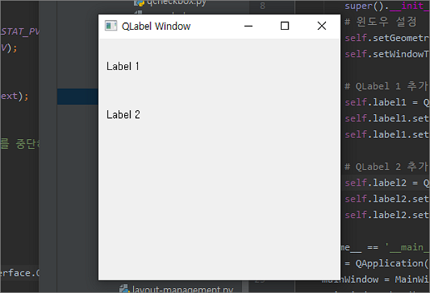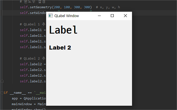 ▼ 먼저 가장 기초적인 QLabel 생성과 텍스트 입력에 관해 알아보겠습니다. QLabel 객체를 생성하고 setGeometry() 를 이용해서 화면에서의 위젯 위치를 정합니다. 그리고 setText() 함수로 라벨에 표시할 텍스트를 입력합니다.