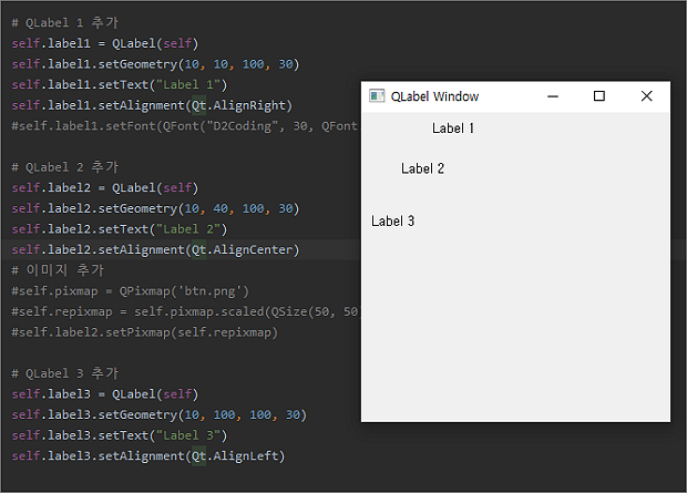 ▼ 폰트 서식 변경을 위한 setFont() 함수의 샘플 코드는 아래와 같습니다. 첫 번째 라벨인 label1 의 인수로 입력한 QFont 객체는 “D2Coding” 폰트와 사이즈 30, 두께 QFont.Bold 로 만들었습니다.