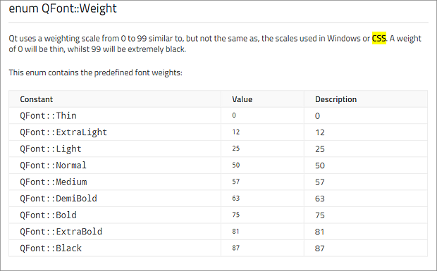 ▼ QLabel 객체에 폰트 디자인을 적용하기 위해서 setFont() 함수를 사용합니다. 인수는 QFont 객체입니다. QFont 객체 생성을 위한 함수는 아래와 같습니다. 첫 번째 인수인 family 는 폰트명입니다. 그리고 pointSize 는 폰트 사이즈입니다. weight 는 폰트의 두께를 말하는데, 1~99 까지 입력이 가능하고 QFont 에서 제공하는 상수 변수를 사용할 수 있습니다.
