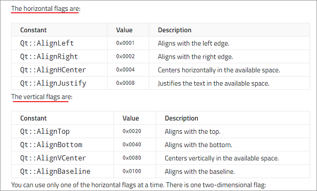 ▼ 기본 라벨내의 텍스트 위치는 왼쪽입니다. 함수는 setAlignment(Qt.Alignment) 를 사용합니다. 함수의 인수 값으로 정렬 속성이 필요한데, 정렬 상수 플래그 값은 아래 표와 같습니다. 좌우, 상하로 구분되어 있습니다.