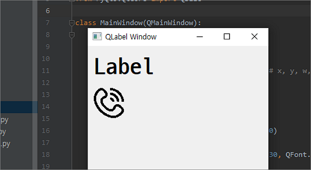 ▼ QLabel 은 텍스트뿐만 아니라 이미지 추가도 가능합니다. QLabel 에 이미지를 추가할 때 사용하는 함수는 setPixmap(QPixmap) 입니다. 인수로 QPixmap 객체가 필요합니다. QPixmap 클래스로 이미지 경로를 입력해서 객체를 생성하고 이미지가 클 경우 라벨에 맞추기 위해 scaled() 를 이용해서 크기를 조절합니다.