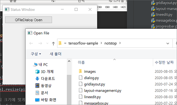 ▼ 이번에는 파일 다이얼로그(QFileDialog) 를 이용해서 사용자가 선택한 이미지를 화면에 표시해 보겠습니다. 추가할 위젯은 QPushButton 과 QFileDialog 입니다. QFileDialog 객체를 생성하고 getOpenFileName() 함수를 이용해서 사용자가 선택한 파일의 정보를 반환받습니다.