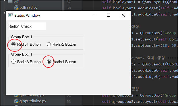 ▼ 다음은 소스를 수정해서 2개의 그룹으로 나누겠습니다. 4개를 2개씩 두 개의 그룹으로 나눠서 선택 여부를 확인하고 싶다면 어떻게 해야 할까요? 쉽게 말해서 하나의 그룹에서 선택하면 다른 그룹의 QRadioButton 에는 영향을 미치지 않게 하는 것입니다. 그러기 위해서는 QGroupBox 를 사용해서 QRadioButton 위젯을 묶어야 합니다. 그런데 QGroupBox 에는 위젯을 바로 추가할 수 없습니다. Layout 객체를 만들어서 QRadioButton 를 추가한 후 QGroupBox 객체에 Layout 을 추가해야 합니다. Layout 클래스는 다양합니다. QBoxLayout, QVBoxLayout, QHBoxLayout, QGridLayout 등이 있는데, 이중에 하나를 골라서 객체를 생성하고 QRadioButton 위젯을 추가합니다.