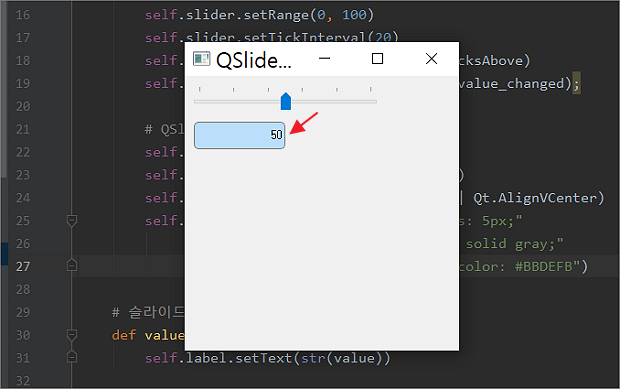 ▼ 다음은 함수를 만들어서 valueChanged() 시그널과 연결합니다. 연결 함수인 value_changed() 에는 valueChanged() 시그널 함수로부터 전달받은 정수값을 QLabel 에 표시합니다.