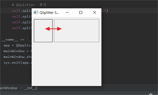 ▼ 생성한 두 개의 QFrame 은 QSplitter 의 addWidget() 함수를 사용해서 모두 추가합니다. 위젯의 정렬 방향은 QSplitter 을 생성할 때 첫 번째 파라미터인 Qt.Orientation 로 결정합니다. Qt.Horizontal 은 위젯을 가로방향으로 정렬합니다.