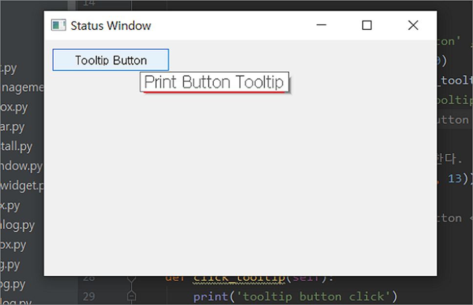 ▼ 먼저 툴팁을 표시할 버튼을 추가합니다. 다음은 개체에 툴팁 세팅을 합니다. 위젯마다 setTooltip() 함수가 있어서 툴팁 개체를 생성할 때 사용합니다. 파라미터로 넘긴 문자열은 툴팁에 표시할 텍스트입니다.