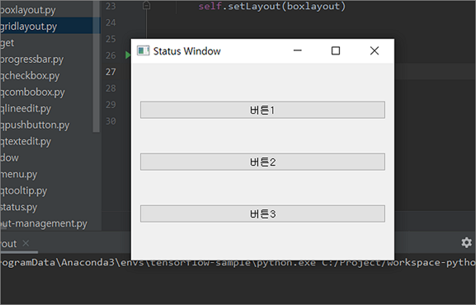 ▼ 먼저 QVBoxLayout 알아보겠습니다. QVBoxLayout 추가한 컨트롤을 세로 방향으로 배치할 때 사용하는 컨트롤입니다. QVBoxLayout 내부에 들어가는 위젯은 버튼으로 하겠습니다. 아래 소스를 통해서 알 수 있듯이 별 다른 설정이 필요없습니다. 그냥 addWidget() 함수를 사용해서 추가하면 자동으로 배치가 됩니다. QVBoxLayout 은 추가한 버튼이 세로로 나열이 되겠죠. 마지막으로 화면에 레이아웃을 추가하기 위해 setLayout() 함수를 사용했습니다.