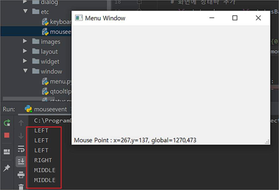 ▼ 마우스 클릭과 관련된 함수는 mousePressEvent() 입니다. 해당 함수로 마우스에 있는 3가지 버튼 중에서 어떤 것을 클릭했는지 구분할 수 있습니다.