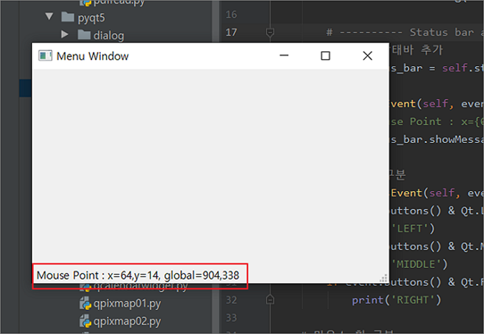 ▼ 다음은 마우스 동작감지를 위한 가상함수인 mouseMoveEvent() 를 추가합니다. 파라미터 정보로 받은 QMouseEvent 객체를 이용해서 현재 마우스 포인트의 좌표 정보를 화면 하단 상태바에 나타냅니다. 좌표정보는 2가지로 구분할 수 있습니다. 프로그램 윈도우 화면을 기준으로 한 좌표와 모니터를 기준으로 한 마우스 좌표 정보입니다. 모니터를 기준으로 한 좌표값은 globalX() 와 globalY() 로 알 수 있습니다.
