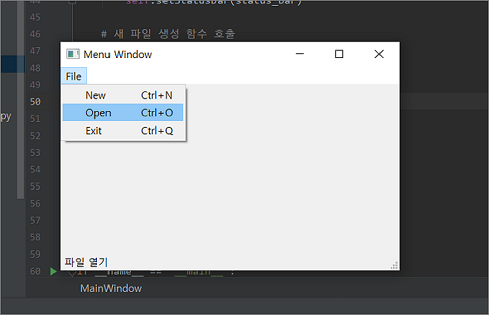 ▼ QAction 으로 추가한 동작 메뉴 객체를 생성할 때 단축키 함수인 setShortcut() 과 상태바에 표시할 텍스트 정보를 setStatusTip() 로 세팅했었습니다. 상태바에 정상적으로 값이 표현되는지 알아보기 위해 QMainWindow 에 상태바를 추가합니다. QMainWindow 의 내장함수 statusBar() 를 이용하면 QStatusBar 객체생성이 가능하며, setStatusBar() 를 이용해서 화면에 바로 추가할 수 있습니다.