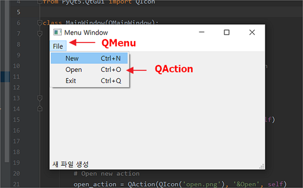 ▼ 위에서 만든 QAction 객체를 QMenuBar 에 추가하겠습니다. 그 전에 동작(action) 이 없는 주 메뉴를 addMenu() 함수로 추가합니다. addMenu() 를 이용해서 추가하는 메뉴 객체는 QMenu 입니다. QMenuBar 에 추가하는 메뉴의 종류에는 QMenu 와 QAction 이 있는데, QMenu 의 하위 드롭다운 메뉴로 들어가는 것이 QAction 입니다. addMenu() 를 이용해서 QMenuBar 에 주 메뉴를 추가하고 그 하위에 addAction() 으로 QAction 를 붙입니다.