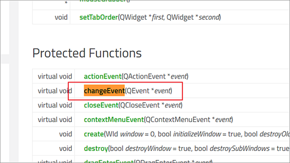 ▼ Qt5 사이트에 가면 QWidget 의 가상함수 중 changeEvent() 가 있는 것을 확인할 수 있습니다. 함수 원형에서 확인할 수 있듯이 매개변수로 QEvent 객체를 받습니다.