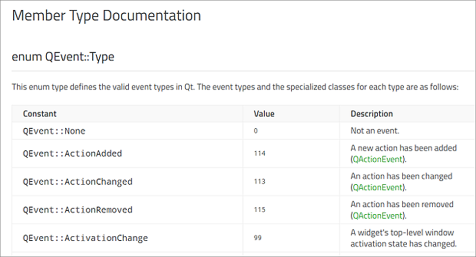 ▼ changeEvet() 함수의 매개변수로 넘어오는 상수값 QEvent.WindowStateChange 의 상세 내용은 아래 사이트 링크에서 확인할 수 있습니다. 어떤 이벤트 타입들이 존재하는지 알고 싶다면 사이트 주소를 참조하시기 바랍니다.
