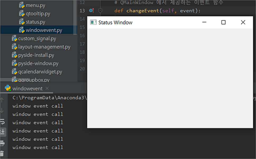 ▼ 윈도우를 최소/최대화 할 때 마다 콜백함수인 changeEvent() 가 실행됩니다. changeEvent() 함수내에 print() 를 추가해서 콘솔에 텍스트를 출력했습니다.