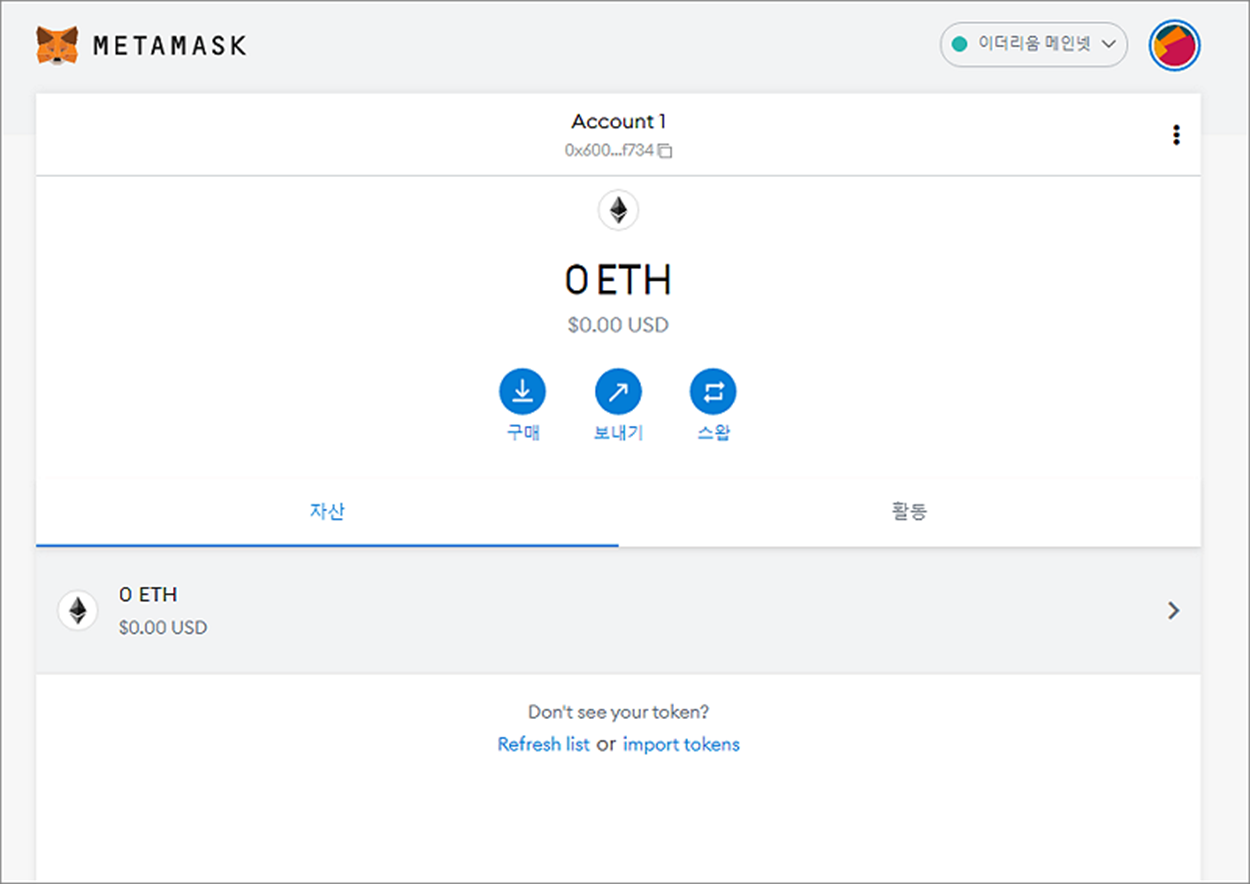 ▼ 이렇게 개인 지갑이 완료되었습니다. 현재는 이더리움 코인만 보입니다. 여기에 다른 코인을 추가하는 방법을 알아보겠습니다. 또한 바이낸스 메인넷은 어떻게 추가하는지 알고 싶다면 아래 포스팅을 참고하세요.