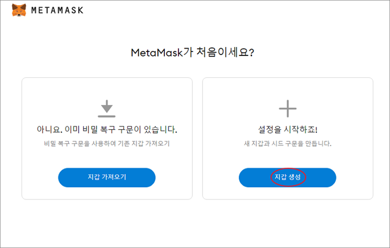 ▼ 처음 사용자이거나 새로운 지갑을 만들고 싶다면 오른쪽에 있는 지갑 생성 버튼을 클릭합니다.