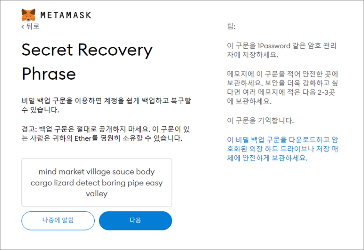 ▼ 화면에 잠금 표시를 클릭하면 12 단어의 백업 문구를 확인할 수 있습니다. 이것은 메타마스크 계정의 비밀번호와 같습니다. 아이디 입력 없이 필요없이 해당 문구만 있으면 개인 지갑에 접근이 가능하기 때문에 반드시 노출을 해서는 안됩니다.