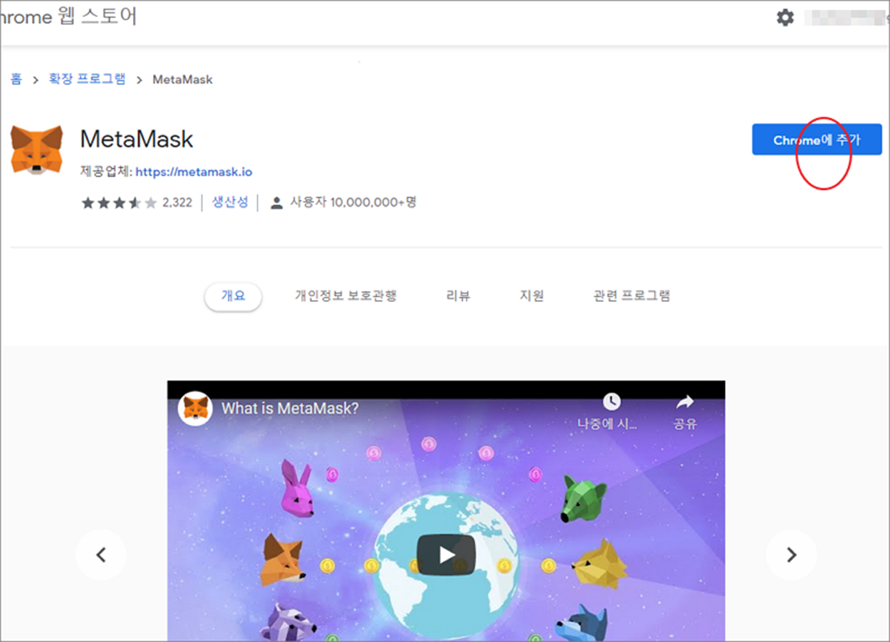 ▼ 다음은 크롬 웹 스토어로 가서 메타마스크 확장 프로그램을 추가합니다. 바로가기 링크는 아래와 같습니다.