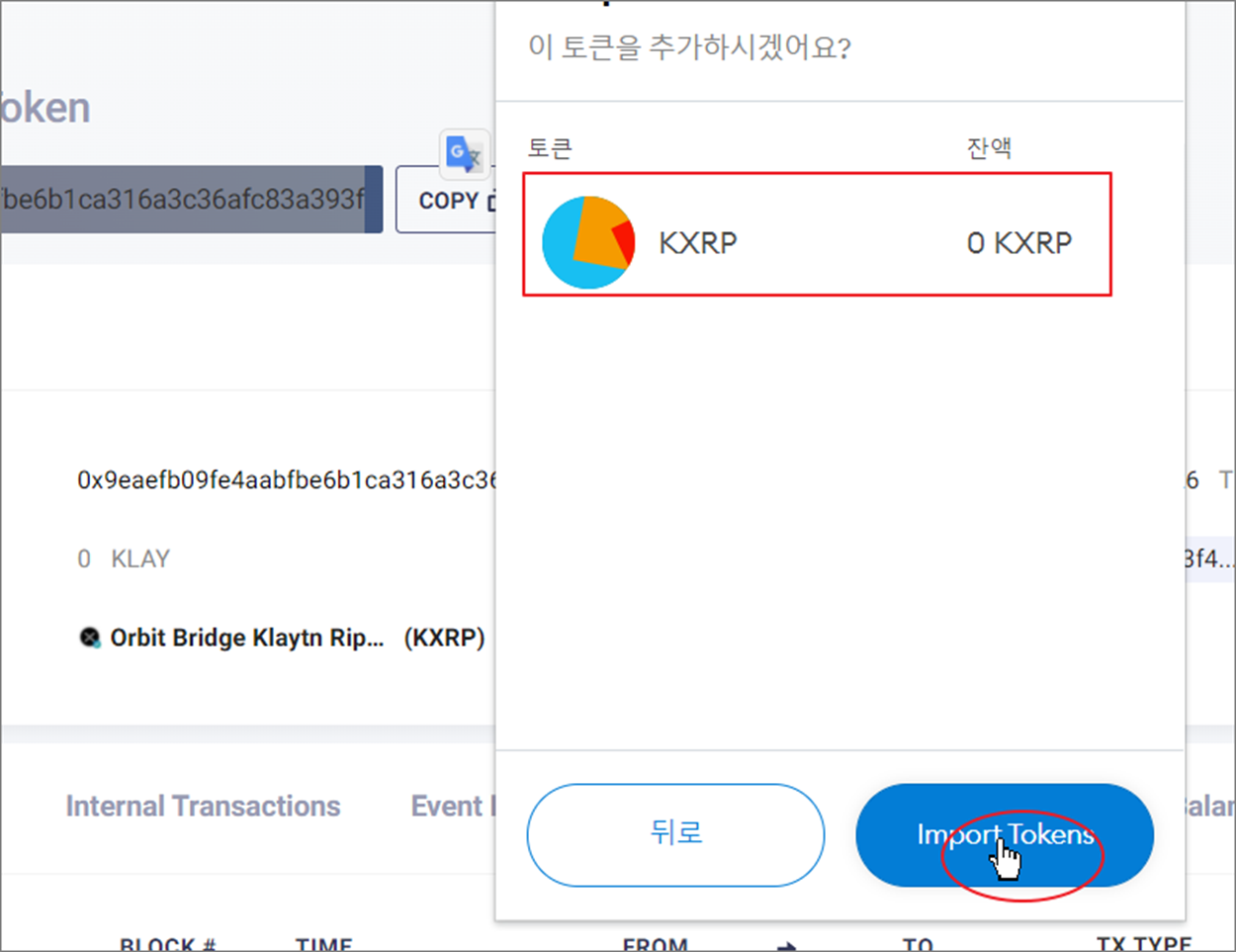 ▼ 다음 페이지에서 추가할 코인을 확인하고 하단에 Import Token 버튼을 클릭합니다.