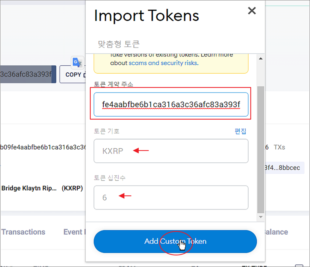 ▼ 토큰 추가 화면이 나타나면 상단 “토큰 계약 주소” 란에 복사한 값을 붙여넣습니다. 아래 나머지 항목은 자동으로 입력됩니다. 만약 나타나지 않으면 토큰 계약 주소가 잘못된 것입니다.