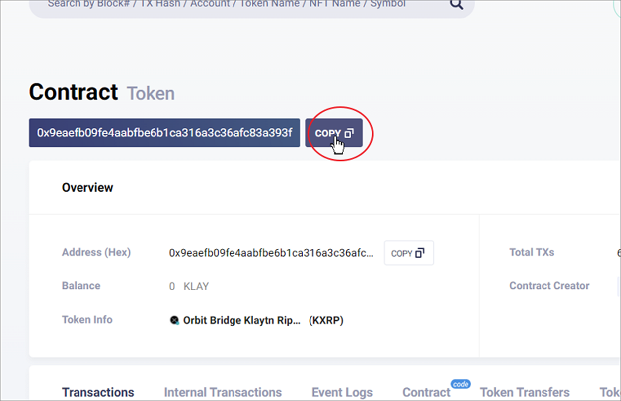 ▼ 코인 상세 정보 창에서 상단에 컨트렉트 주소를 복사합니다. 드래그해서 Ctrl + C 를 누르는 것보다 COPY 버튼을 누르는 것이 편할 겁니다.