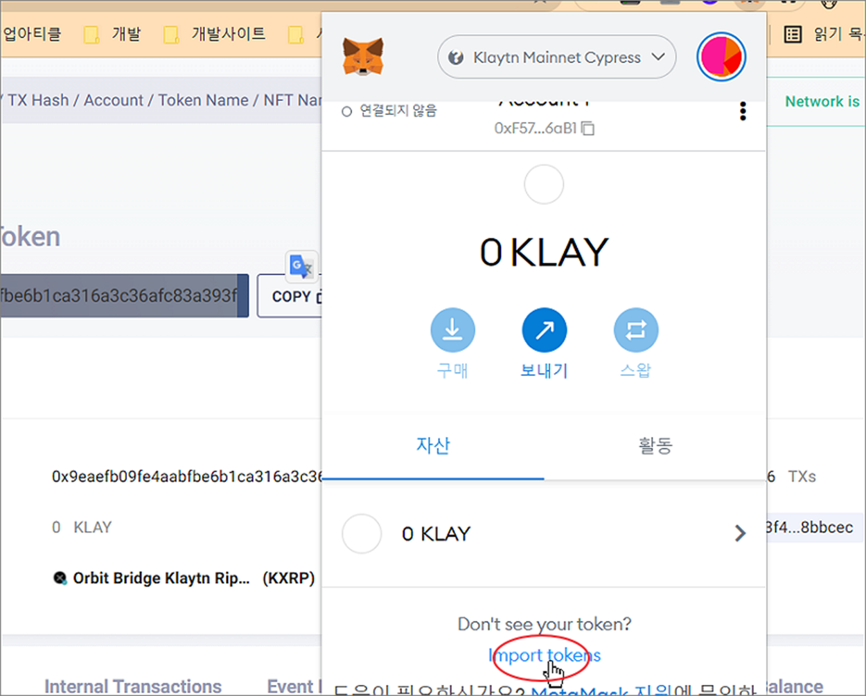 ▼ 클립보드에 복사한 주소를 메타마스크에 추가해 보겠습니다. 메인넷을 클레이튼으로 바꾼 후 화면 하단에 Import tokens 을 클릭합니다.