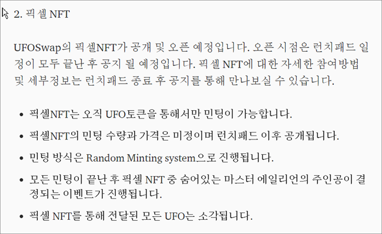 12월 말에 픽셀 NFT 를 출시합니다. UFO 디파이 거래서에서 출시하는 픽셀 NFT 는 자체 발행한 UFO 코인으로만 민팅이 가능합니다. 픽셀 NFT 에는 숨겨진 이벤트가 있는데, 랜덤으로 “마스터 에일리언” 이 주어집니다.