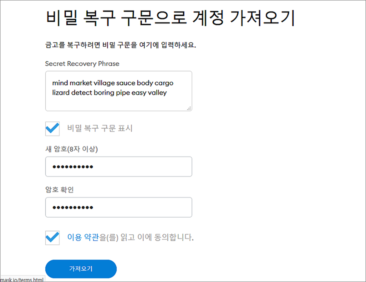 ▼ 백업해 놓은 복구 구문과 함께 로그인할 때 사용할 비밀번호를 입력하고 가져오기 버튼을 클릭합니다.