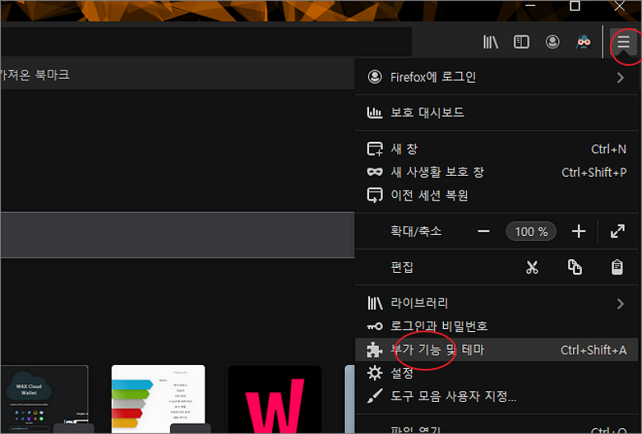▼ 파이어폭스 브라우저를 실행하고 확장 프로그램을 설치하기 위해 오른쪽 더보기 > 부가 기능 및 테마 를 선택합니다.