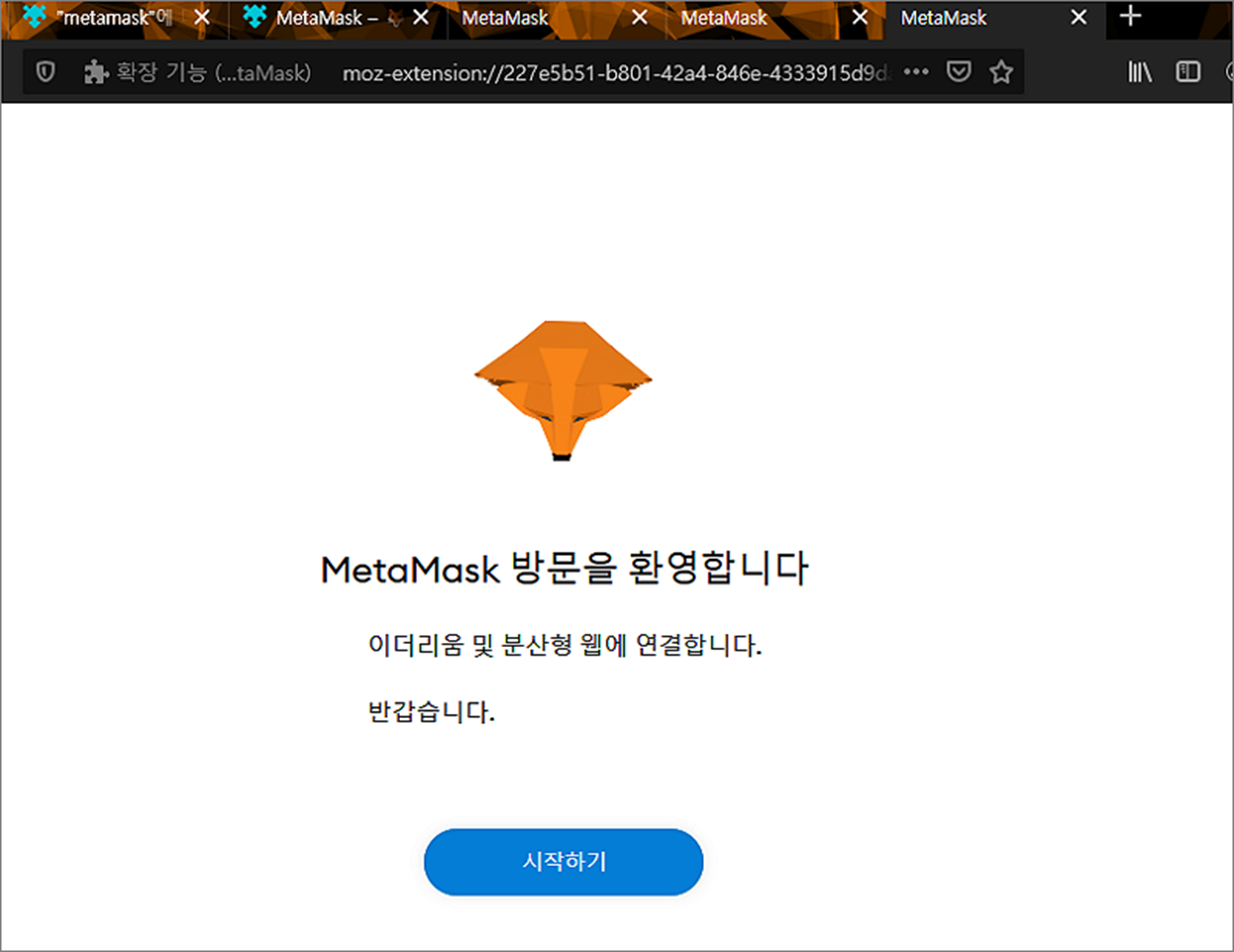▼ 설치가 완료되고 메타마스크 지갑 관리를 위한 첫 번째 화면이 나타납니다. 새로운 지갑 생성을 위해 화면 중앙에 시작하기 버튼을 누릅니다.
