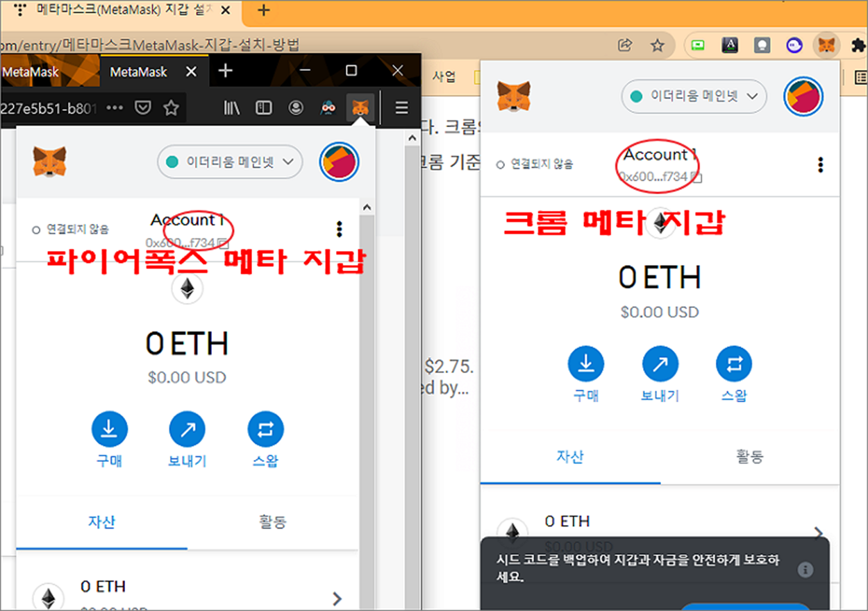▼ 파이어폭스에 설치한 메타마스크와 크롬 메타마스크의 주소가 동일한지 확인해 봅니다. 둘의 주소가 같다면 복구 구문을 통해 이전 크롬 브라우저에 있던 지갑 정보를 성공적으로 가져온 것입니다.