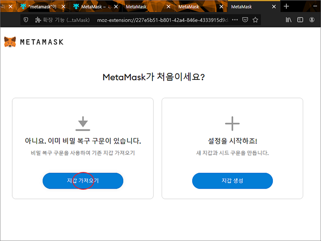 ▼ 다른 브라우저에 있는 이전 메타마스크 지갑을 복구하고 싶다면 지갑 가져오기 버튼을 클릭합니다.