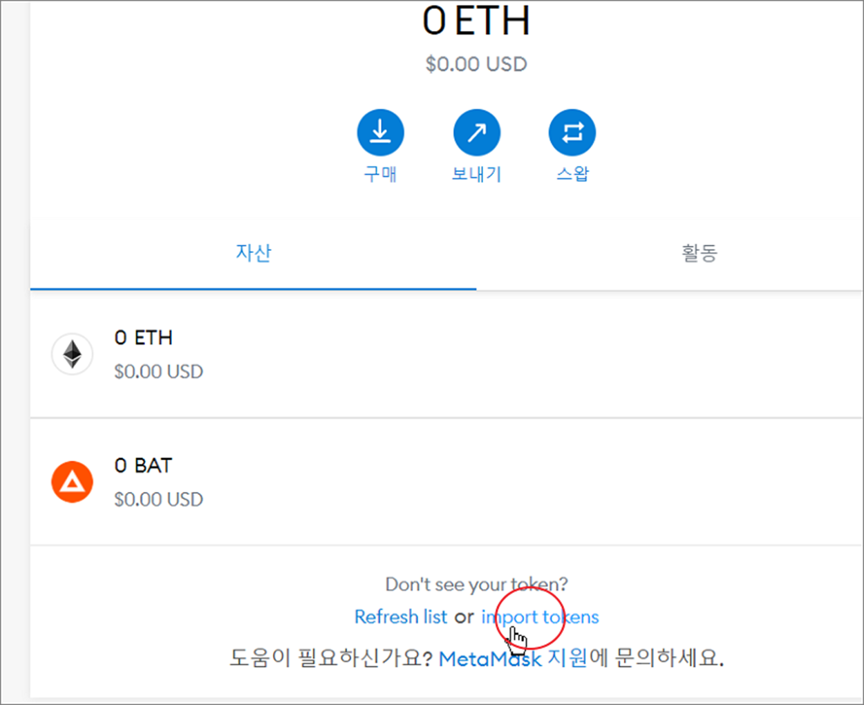 ▼ 다음 코인 목록 화면 아래에서 코인 추가 버튼인 Import Tokens 링크를 클릭합니다.
