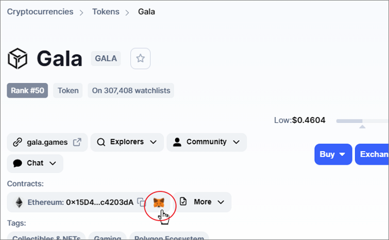 ▼ Gala 코인 상세 페이지에 보시면 Contracts 라는 항목이 있습니다. 현재 크롬을 사용하고 있다면 여우 모양의 아이콘을 클릭합니다.