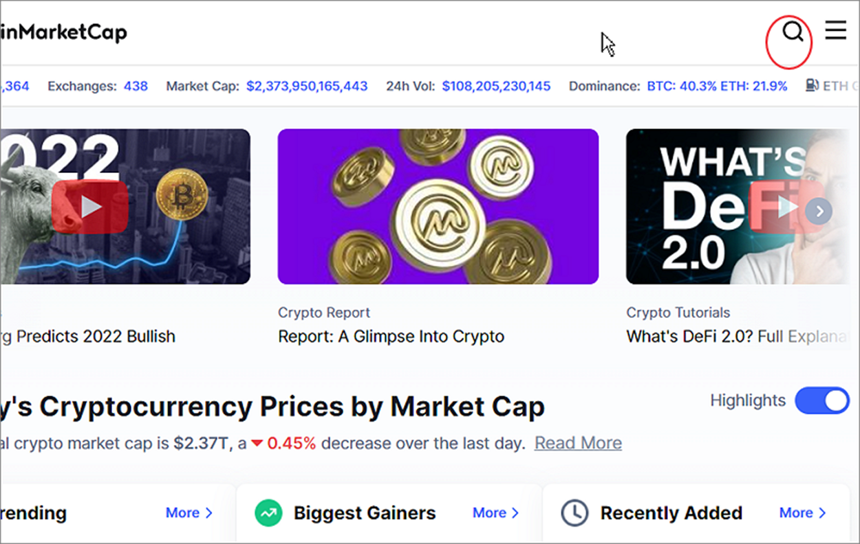 ▼ 두 번째는 코인 관련 정보를 종합해서 관리하는 CoinMarketCap 에서 추가하는 방법입니다. 아래 사이트로 접속해서 코인 검색을 위해 오른쪽 상단 돋보기 아이콘을 클릭합니다.