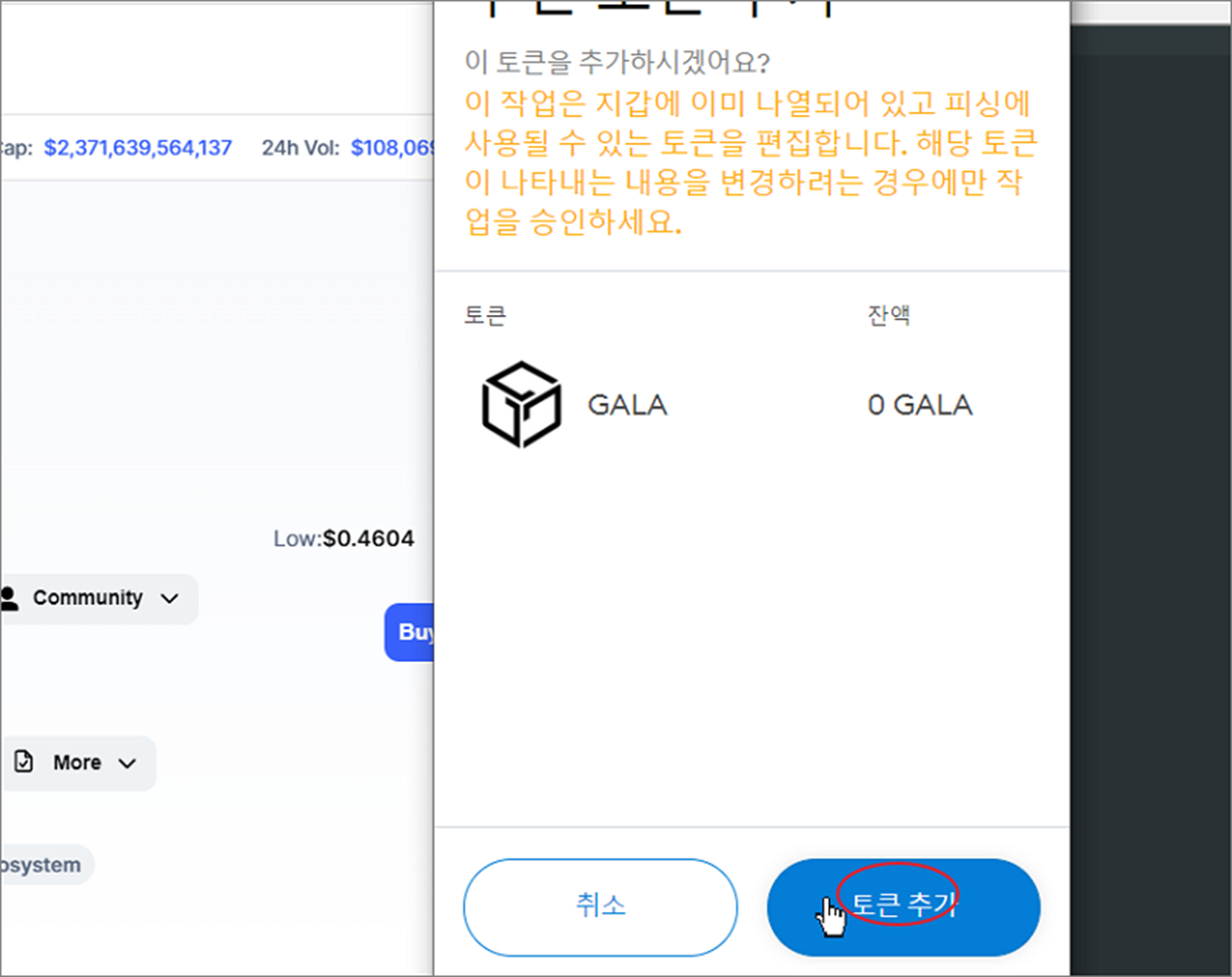 ▼ 웹 페이지에서는 설치되어 있는 메타마스크 확장 프로그램과 연동이 되기 때문에 그림처럼 자동으로 코인 추가 화면이 뜹니다. 첫 번째 방법처럼 계약 주소를 복사해서 추가하는 번거로운 작업을 할 필요가 없습니다. 메타마스크가 띄운 팝업창에서 토큰 추가 버튼을 눌러 코인을 추가합니다.