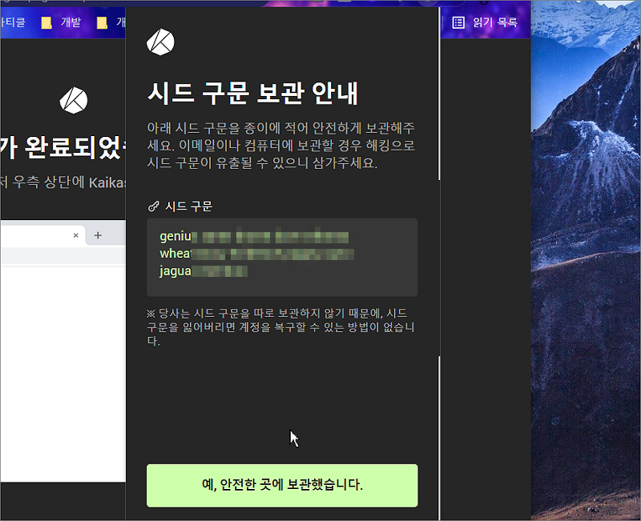 ▼ 지갑 생성을 완료하기 위해서는 다음에 지갑 연결을 위한 시드 구문을 보관해야 합니다. 시드 구문 화면에서는 12개의 단어를 따로 적어서 보관합니다. 코인을 관리하는 개인 지갑은 흔히 사용하는 아이디/패스워드로 로그인하지 않습니다. 12 단어로 이루어진 시드 구문만 있으면 어디에서든 접근이 가능합니다.