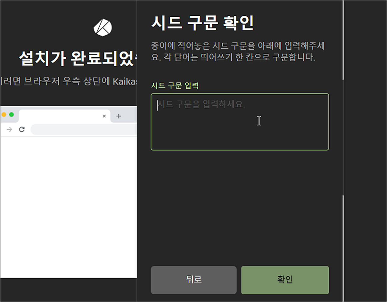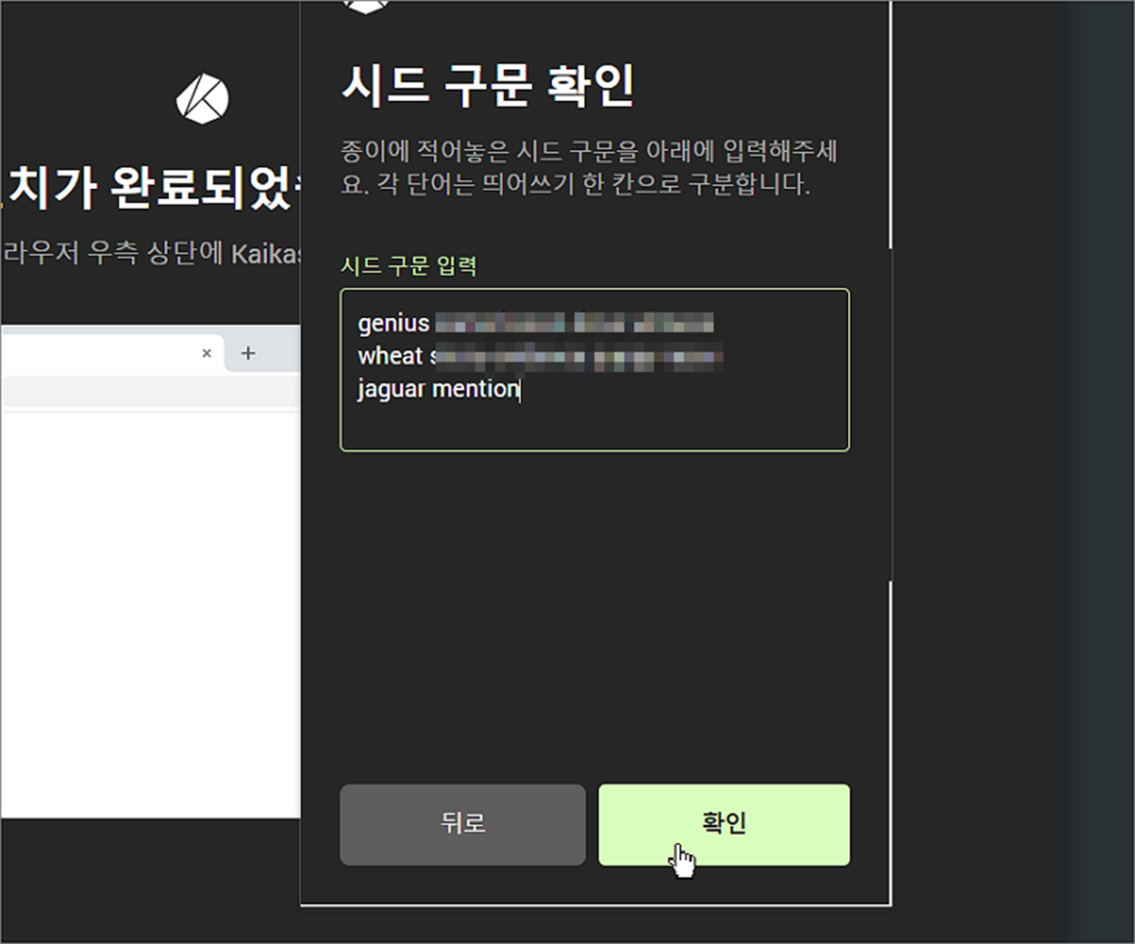 ▼ 다음 화면에서는 이전 시드 구문을 확인하는 차원에서 “시드 구문 입력” 란에 기입을 해야 합니다.