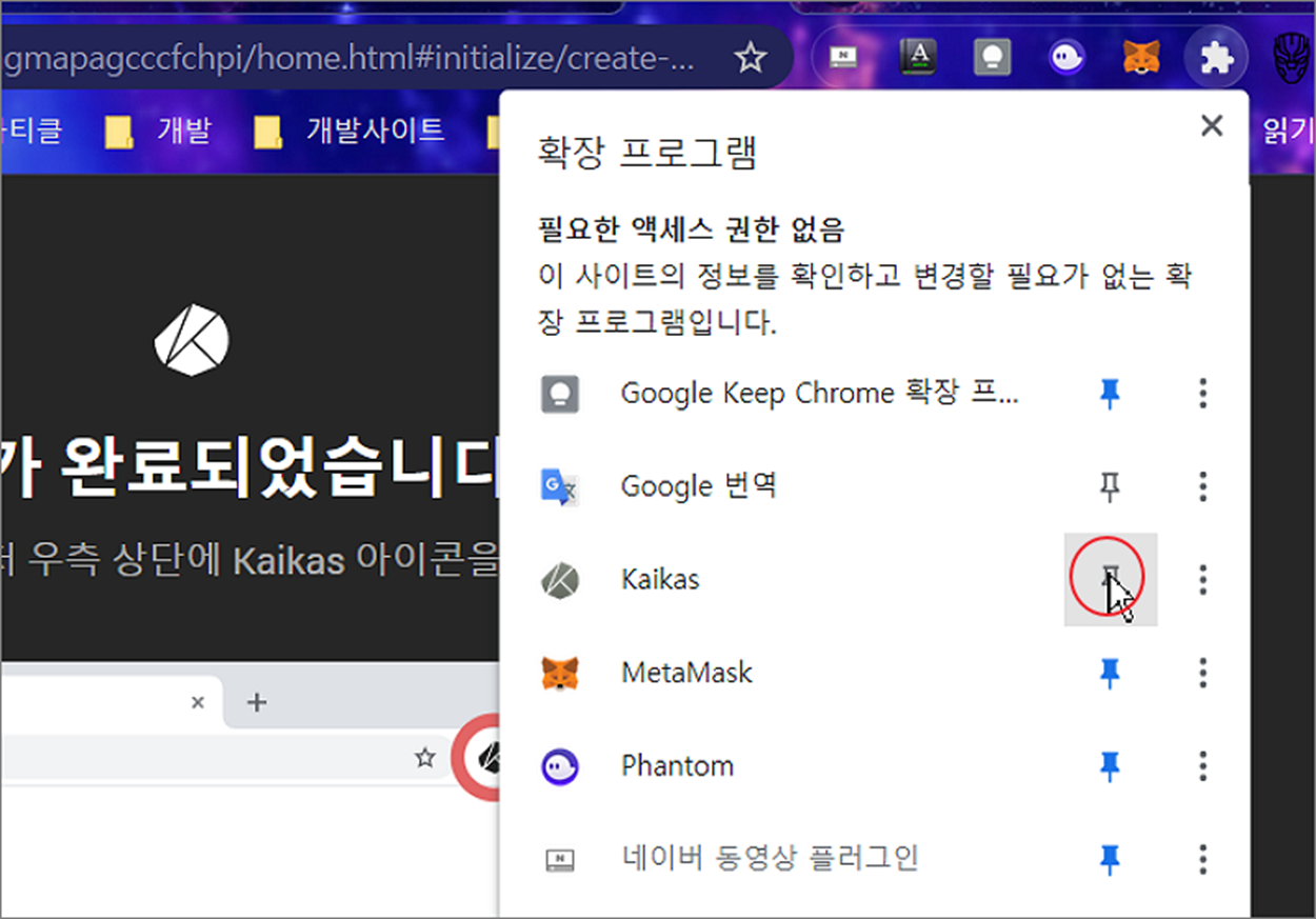 ▼ 설치가 끝나면 크롬 오른쪽 상단 확장 프로그램 목록에 나타납니다. 아이콘이 화면에 항상 보이도록 핀 버튼을 눌러 고정합니다.