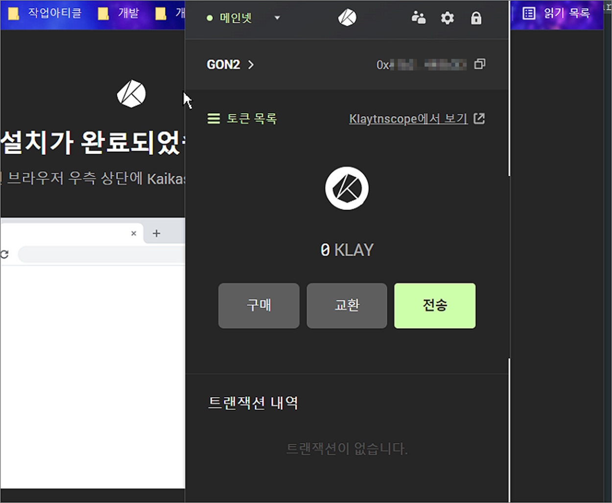 ▼ 크롬 브라우저에 카이카스 지갑 생성이 완료되었습니다. 이제 클레이튼 관련 코인들을 전송 및 관리할 수 있습니다.