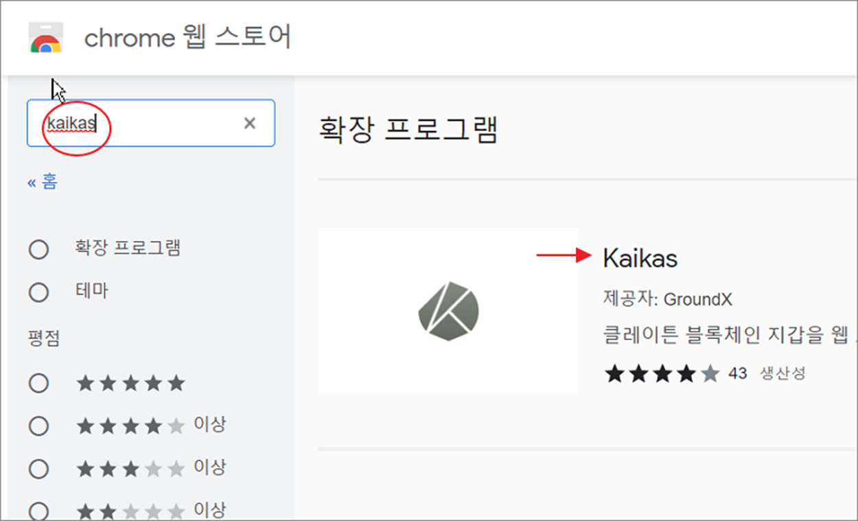 ▼ 크롬 브라우저를 실행하고 웹 스토어로 접속합니다. 크롬 웹 스토어에서 검색란에 “kaikas” 라고 입력합니다. 오른쪽 검색 결과에서 Kaikas 를 찾아 설치를 위해 클릭합니다.