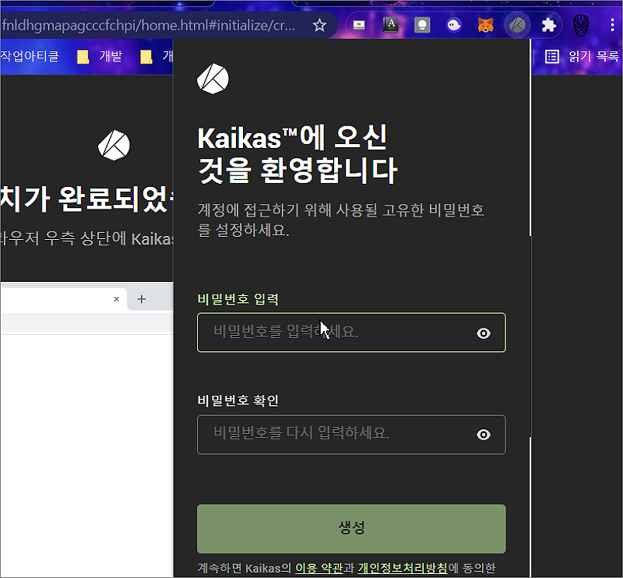 ▼ 이제 자신만의 지갑을 생성할 차례입니다. 카이카스 앱을 실행해서 팝업창을 띄웁니다. 화면에 첫 지갑 생성을 위해 동일한 비밀번호를 두 번 입력합니다.