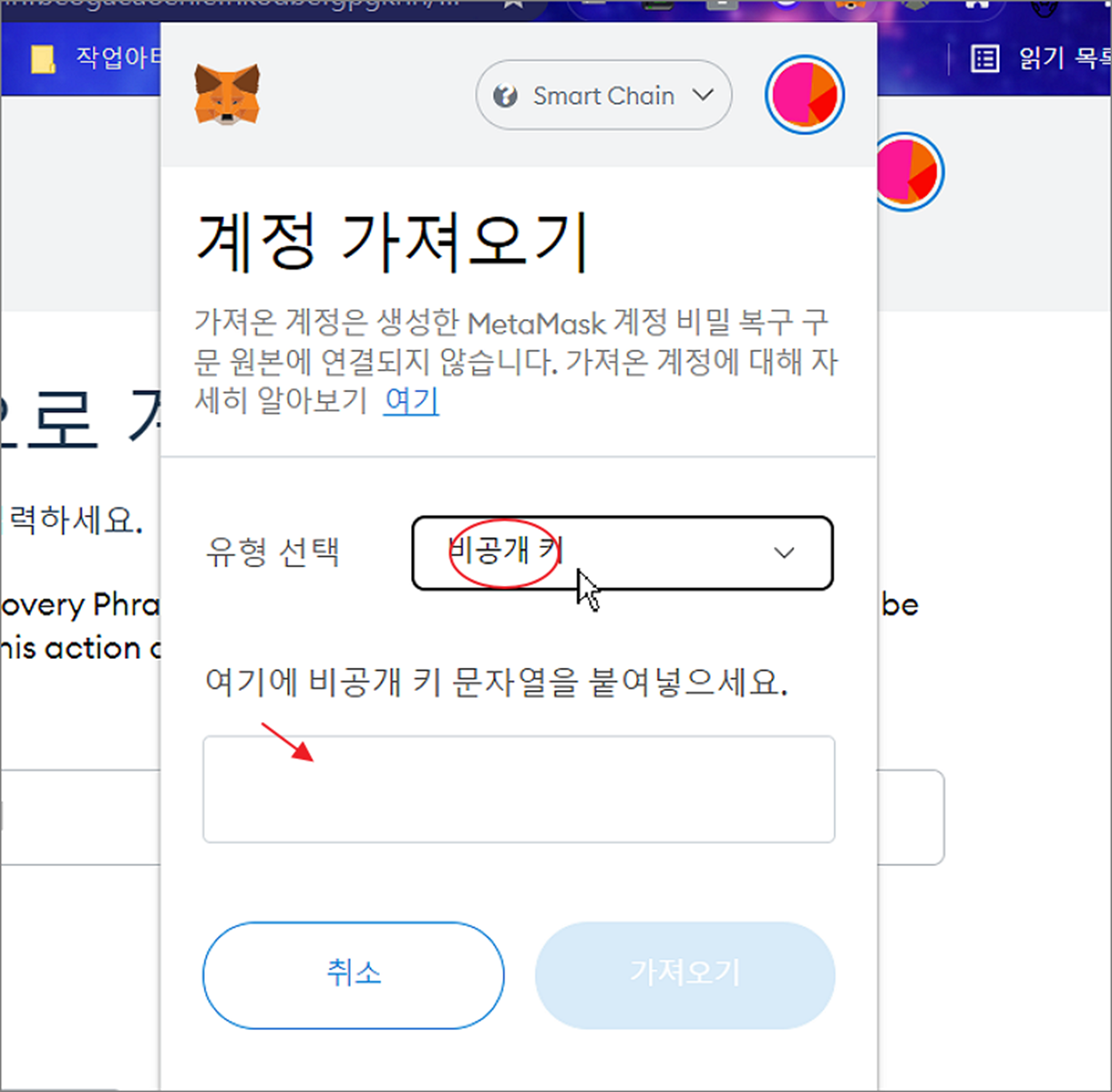 ▼ 계정 가져오기 화면에서 유형 선택 옵션을 비공개 키로 선택합니다. 그리고 바로 아래에 키 문자열을 복사해서 붙여 넣습니다.