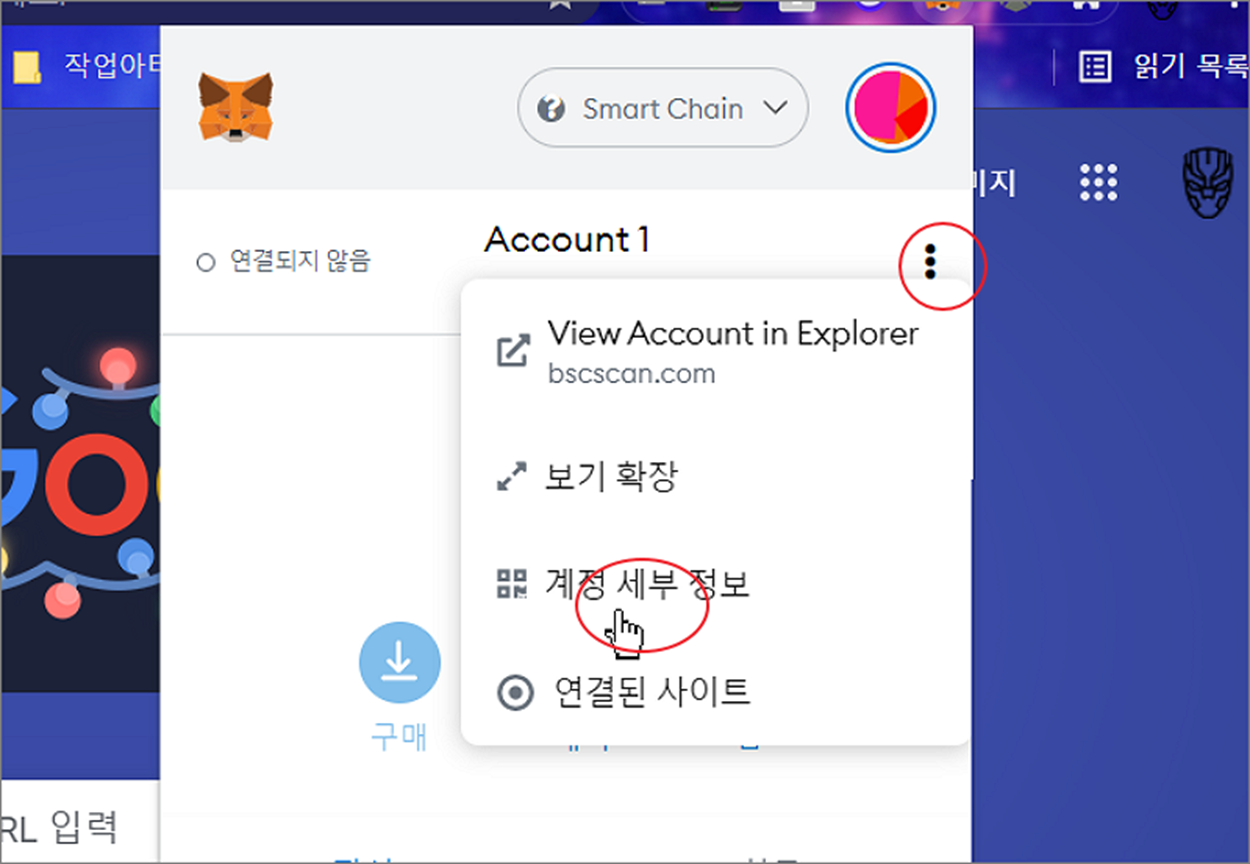 ▼ 다음은 메타마스크 화면 오른쪽 상단에 더보기 > 계정 세부 정보 메뉴를 선택합니다.