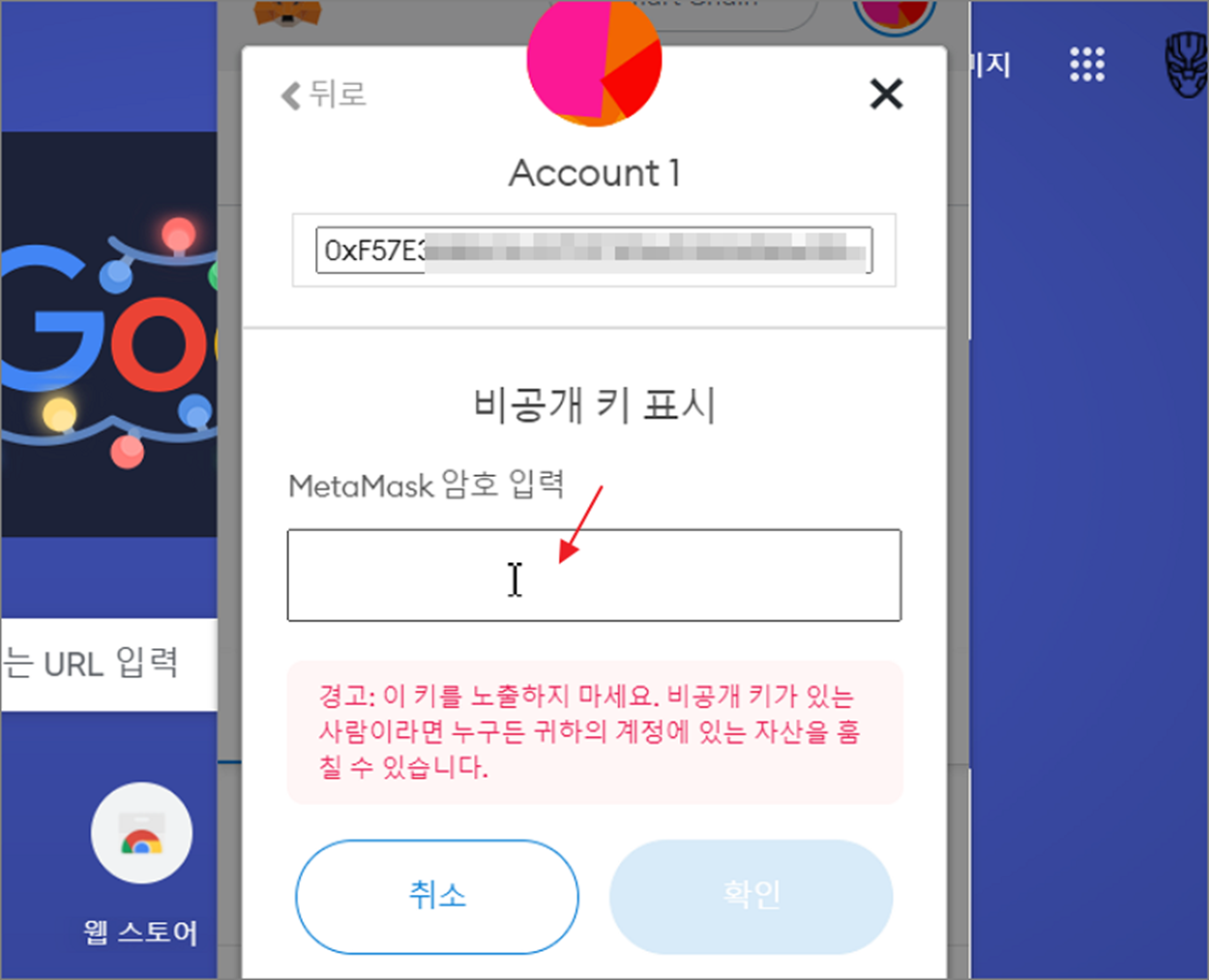 ▼ 다음 화면에서는 키를 내보내기 전에 한번 더 메타마스크 로그인 암호를 입력해야 합니다.