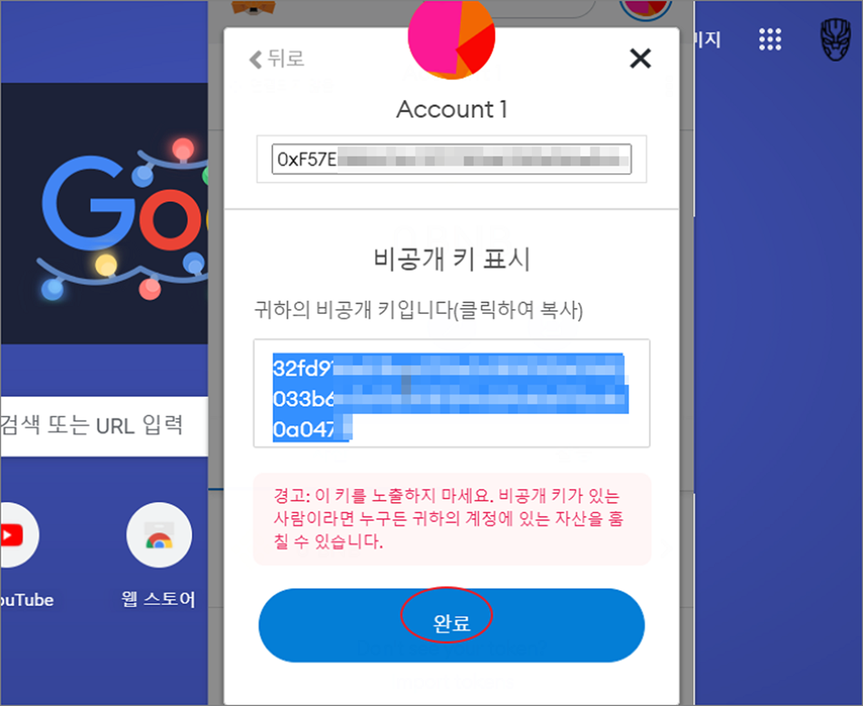 ▼ 비밀번호를 정상적으로 입력하고 나면 비공개키를 보여줍니다. 이제 비공개 키를 복사해서 따로 보관합니다.